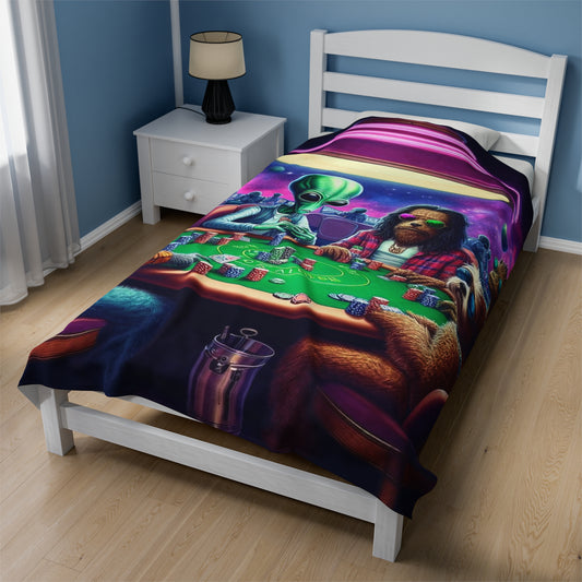 Aliens and Dogs playing Poker Velveteen Plush Blanket