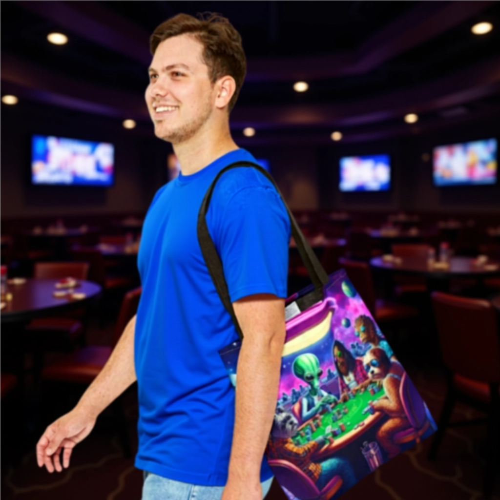 Unleash your quirky side with our tote bags! With aliens playing poker with dgos, these bags have got you covered. Perfect for adding a unique touch to your outfit and showing off your personality. Find your favorite and make a statement today. (No aliens were harmed in the making of these bags) Carry anything and everything in our unique tote bag! These totes are roomy and easy to access These bags come with multiple handle colors to match your designs. Made with spun polyester, these bags feature double-stitched seams, cotton webbing straps, and nonwoven laminate lining for high-end durability. Designed by humans, made by AI.