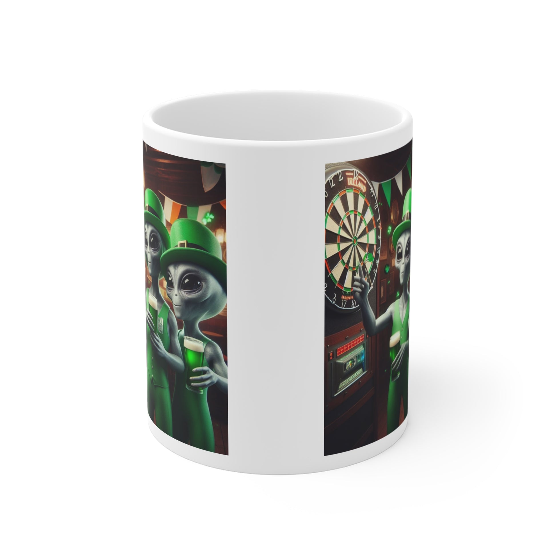 Rev up your morning routine with this out-of-this-world white coffee mug featuring our Irish guys throwing darts in the pub! And you didn't even notice! Perfect for anyone looking to add a touch of quirkiness to their daily cup of joe. 11 oz. Dishwasher safe. Designed and assembled by humans, art assisted by AI.