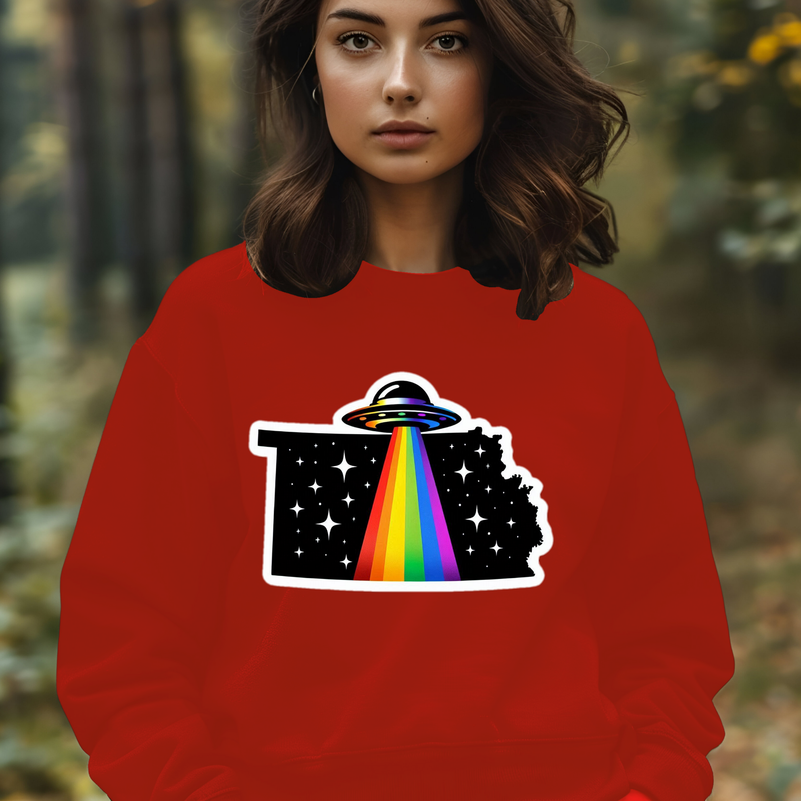 Show off your extraterrestrial pride with our Alien Pride States (and DC) sweatshirt, featuring Kansas! With this unique design, you can represent your state (or collect them all!) in a fun and quirky way. Stay comfortable and stylish with this one-of-a-kind sweatshirt. The unisex soft cotton sweatshirt is a seamless blend of comfort and style. The fiber is a blend of cotton and polyester. The seams have ribbed knitting. Durability is further assured by the inclusion of neck tape backing. As such, the collars are elastic and stretchy. Designed by humans made by AI.