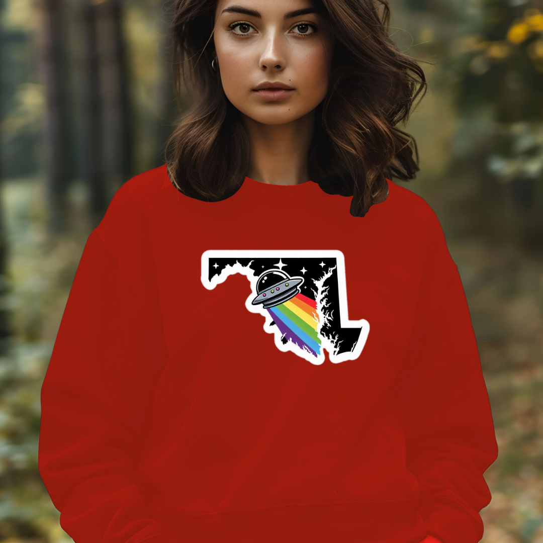 Show off your extraterrestrial pride with our Alien Pride States (and DC) sweatshirt, featuring Maryland! With this hot and unique design, you can represent your state (or collect them all!) in a fun and quirky way. Stay comfortable and stylish with this one-of-a-kind sweatshirt. The unisex soft cotton sweatshirt is a seamless blend of comfort and style. The fiber is a blend of cotton and polyester. The seams have ribbed knitting. Durability is further assured by the inclusion of neck tape backing. As such, the collars are elastic and stretchy. Designed by humans with AI. Colors may vary.