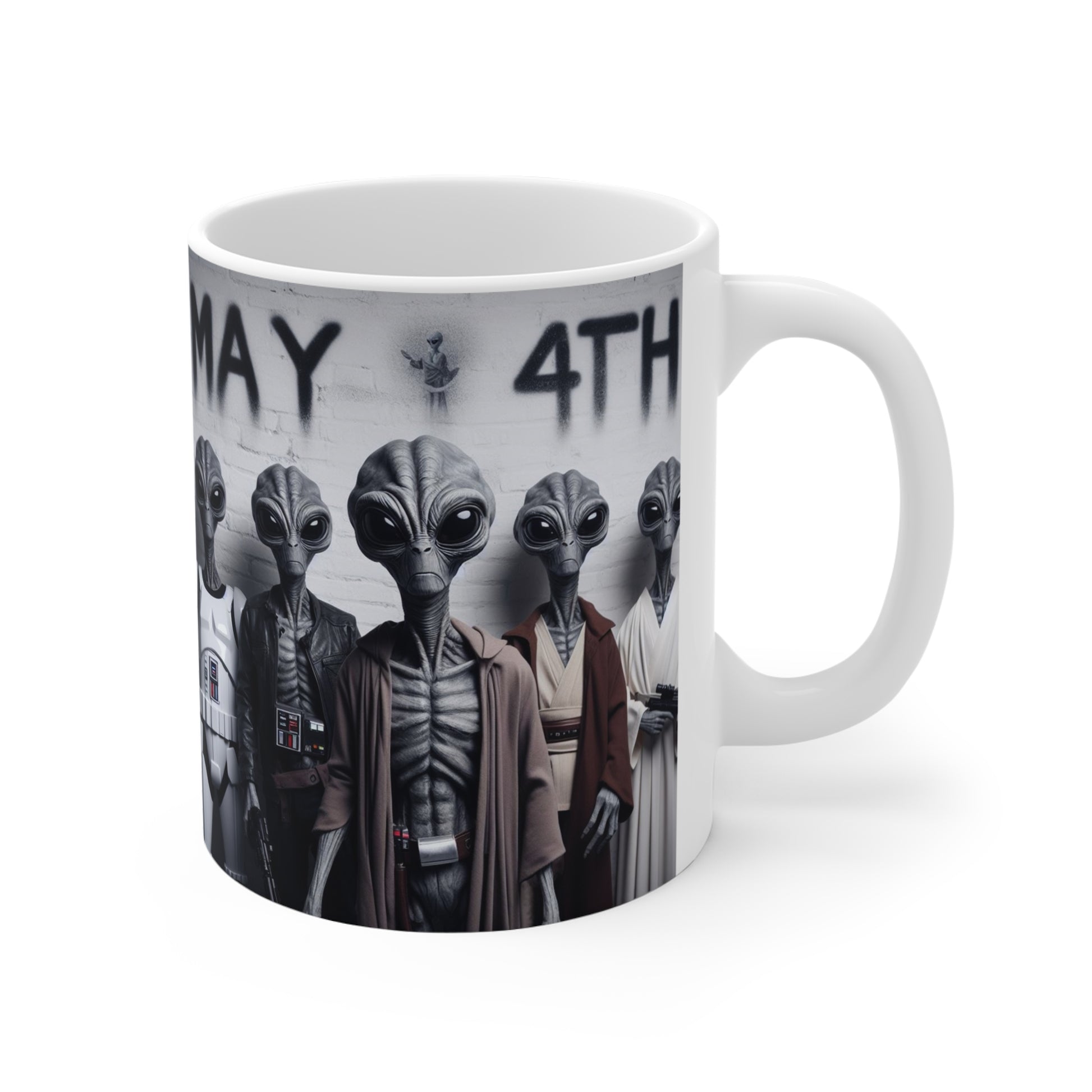 Rev up your morning routine with this out-of-this-world white coffee mug featuring our aliens, who love the movie franchise that began in 1978, (and continues on) dressed up in costume for a May the Fourth party! Perfect for anyone looking to add a touch of quirkiness to their daily cup of joe. 11 oz. Dishwasher safe. Designed and assembled by humans, art assisted by AI.