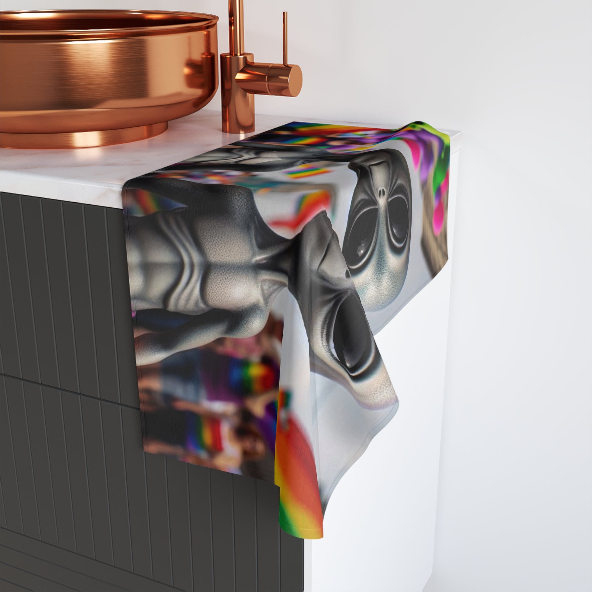 Get a new and unique towel for your gym bag, bathroom or car! Our Pride Aliens towel is a perfect addition! Made with a polyester front that is a perfect canvas for printing and a soft cotton back, this premium hand towel is soft, light, and absolutely chic. .: Materials: 100% polyester (front), 100% cotton (back) .: One size: 16″ × 28″ (40.6cm × 71.1cm) .: Soft to the touch .: Print on one side