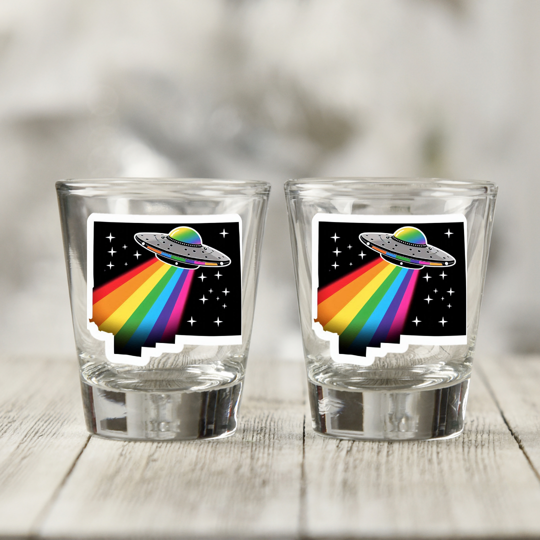 Introducing our custom States of Pride shot glasses! We have all 50 states and the territories too! Made from high-quality, clear glass, these sturdy shot glasses are the perfect addition to any bar or collection. With a solid glass base and a standard 1.5oz size, they are not only functional but also aesthetically pleasing. Order yours today!