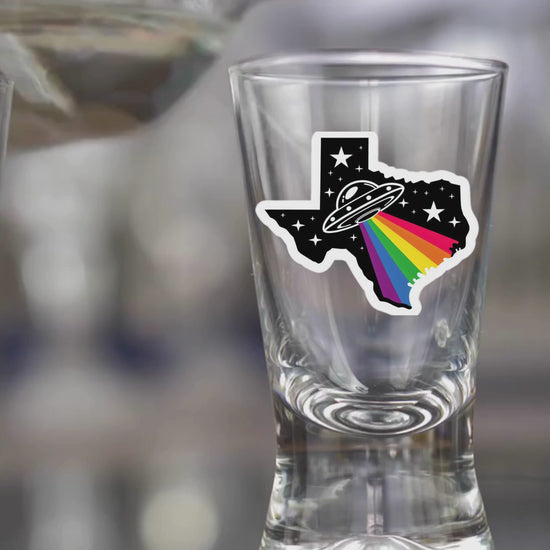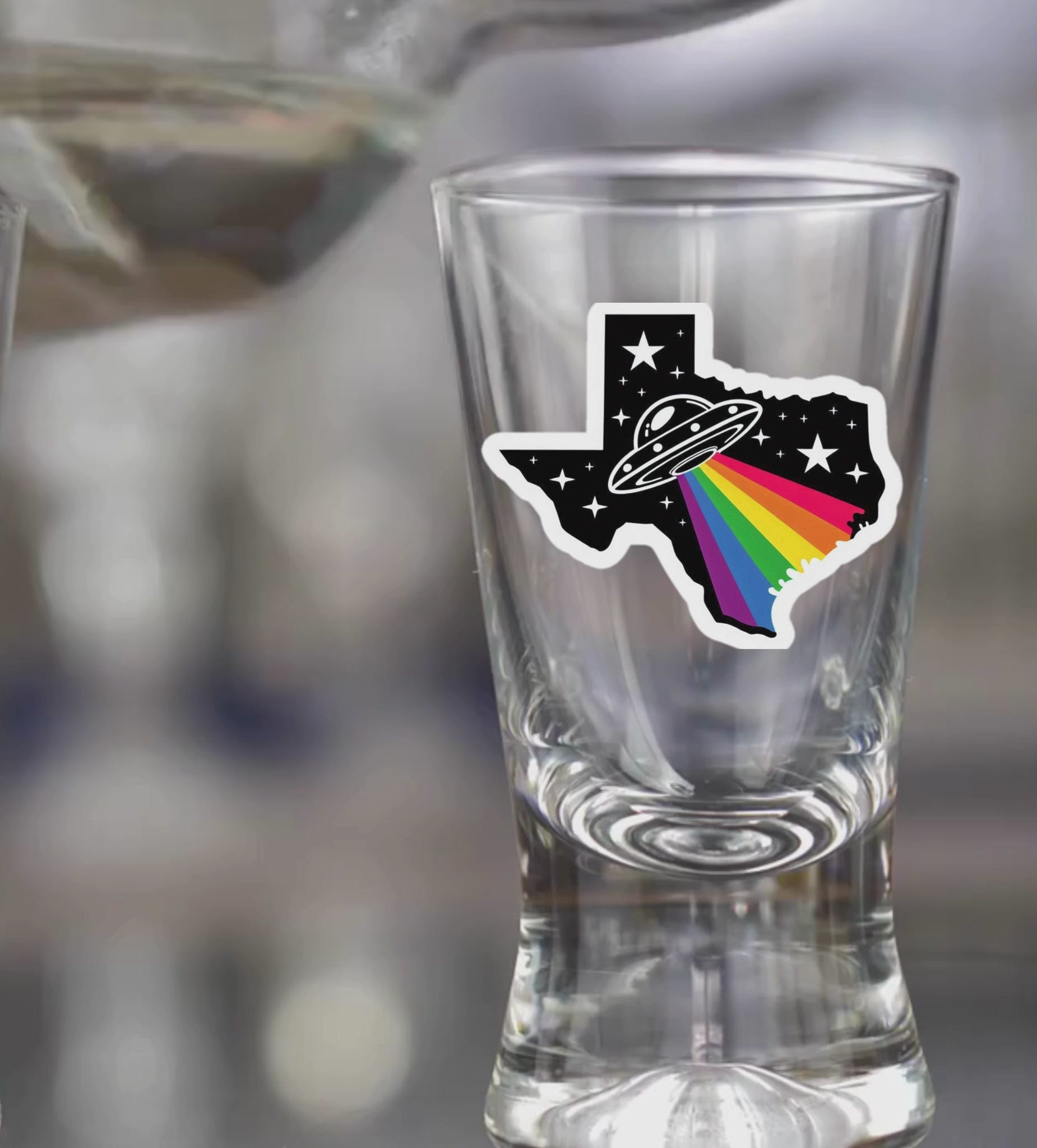 Introducing our custom States of Pride shot glasses, featuring Texas! We have all 50 and all the territories too! Made from high-quality, clear glass, these sturdy shot glasses are the perfect addition to any bar or collection. With a solid glass base and a standard 1.5oz size, they are not only functional but also aesthetically pleasing. Order yours today! Designed by humans with AI.