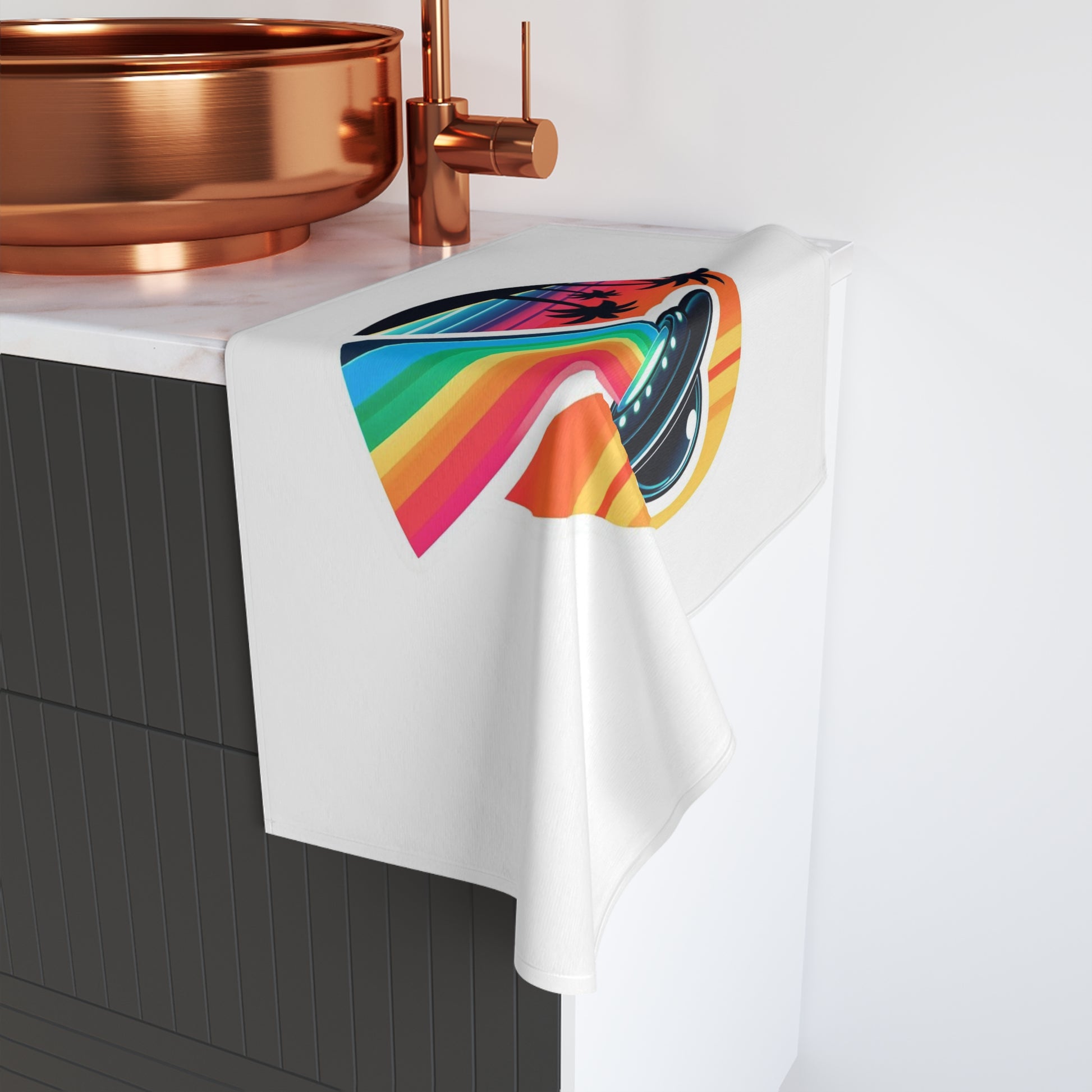 Get a new and unique towel for your gym bag, bathroom or car! Aliens in Paradise is a perfect addition! Made with a polyester front that is a perfect canvas for printing and a soft cotton back, this premium hand towel is soft, light, and absolutely chic. .: Materials: 100% polyester (front), 100% cotton (back) .: One size: 16″ × 28″ (40.6cm × 71.1cm) .: Soft to the touch .: Print on one side