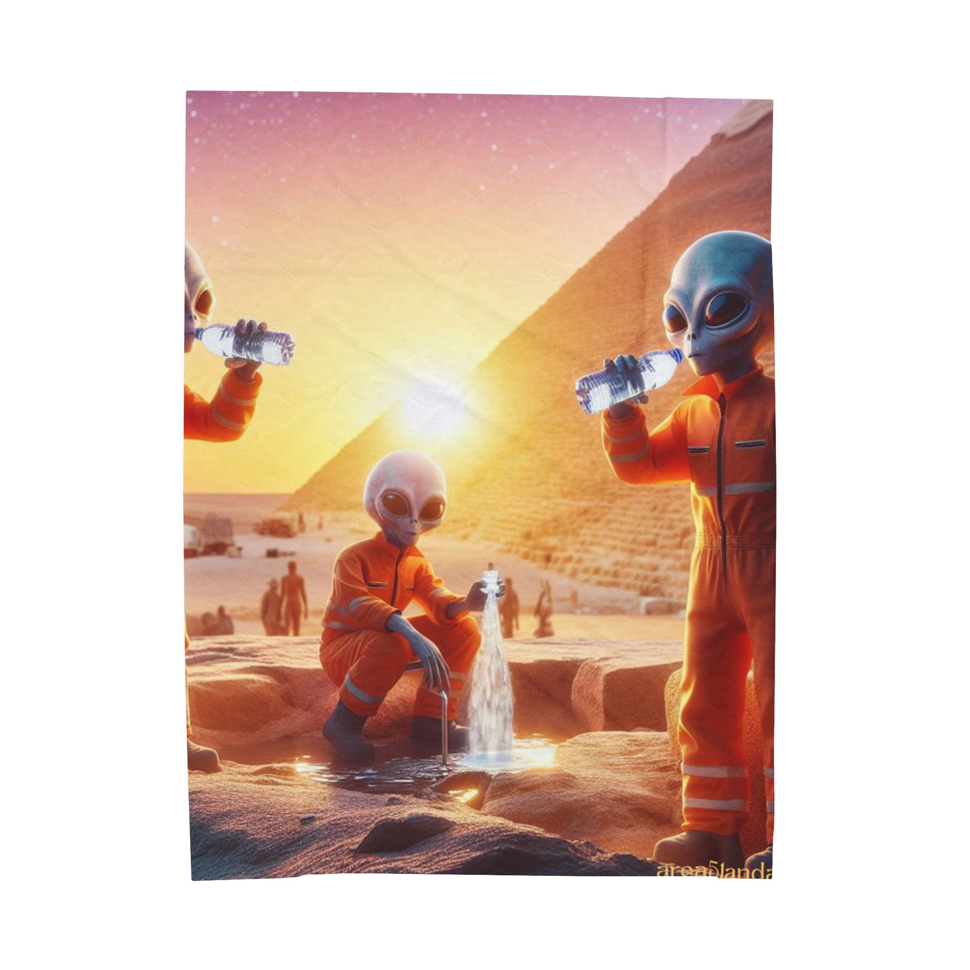 Be a conversation piece with this alternative history of the building of the Pyramids at Giza. It could have happened this way! Designed by humans and realized by AI. Create a cozy and warm atmosphere at home with this plush velveteen blanket. It is soft to touch and perfect for any home. Fantastic for gifts! Ask about Personalization options! Available in three sizes: 30x40", 50x60", 60x80".